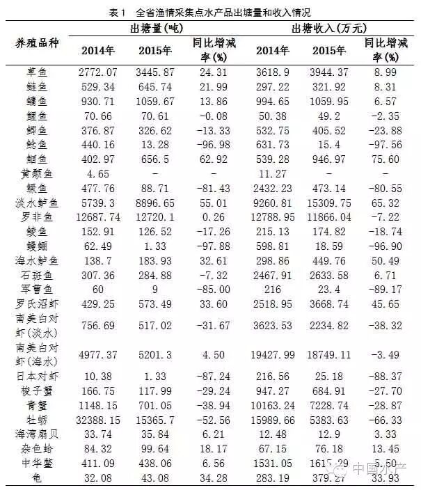 2015年,全省渔情采集点出塘量56899.38吨,同比减少18.91%,出塘收入89926.11万元,同比减少11.71%。养殖渔情采集品种共有27个,其中草鱼、鲢鱼、鳙鱼、鮰鱼、淡水鲈鱼、海水鲈鱼、罗氏沼虾、扇贝、杂色蛤、中华鳖、龟等11个品种出塘量和出塘收入同比增加;鲤鱼、鲫鱼、鲶鱼、鳜鱼、鲮鱼、鳗鲡、军曹鱼、南美白对虾(淡水)、日本对虾、梭子蟹、青蟹、牡蛎等12个品种出塘量和出塘收入同比减少;罗非鱼、南美白对虾(海水)等2个品种出塘量同比增加,但收入同比减少;石斑鱼品种出塘量同比减少,但收入同比增加;由于采集点转养其他品种原因,2015年黄颡鱼未能采集到相关数据(表1)。