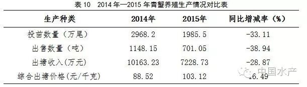 2015年,渔情采集点青蟹投苗数量1985.5万尾,同比减少33.11%;出售成蟹701.05吨,同比减少38.94%;市场价格103.12元/千克,同比上涨16.49%;收入金额是7228.73万元,同比减少28.87%(表10)。