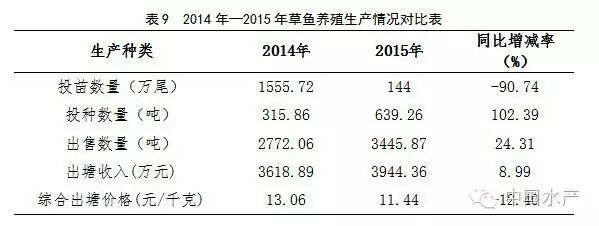 2015年,渔情采集点草鱼投苗数量144万尾,同比减少90.74%;投种数量639.26吨,同比增加102.39%;出售成鱼3445.87吨,同比增加24.31%;市场价格11.44元/千克,同比减少12.40%;收入金额是3944.36万元,同比增加8.99%(表9)。