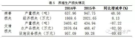 2015年,采集点养殖病害产量损失947.75吨,经济损失2021.65万元,同比增加48.56%和8.13%,灾害损失434.94吨,同比减少87.22%,经济损失468.47万元,同比减少82.50%,设施设备损失99.28万元,同比增加减少89.63%(表5)。