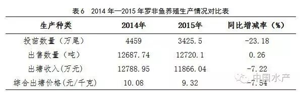 2015年,渔情采集点投放罗非鱼苗3425.5万尾,同比减少23.18%;出售成鱼12720.1吨,同比增加0.26%;市场价格9.32元/千克,同比减少7.54%;收入金额是11866.04万元,同比减少7.22%(表6)。