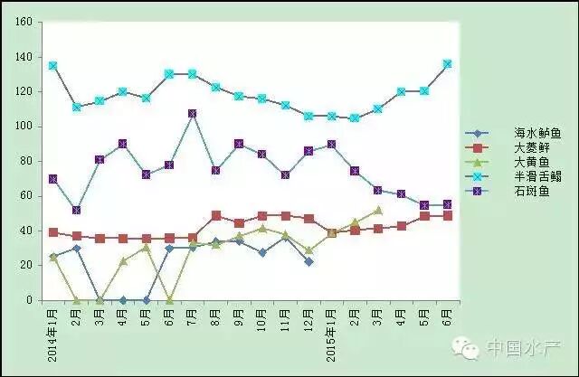 3.海水鱼类。大黄鱼、大菱鲆、石斑鱼综合出塘价格同比上涨,其中大黄鱼出塘价格为32.71元/千克,涨幅达34.57%;海水鲈鱼、半滑舌鳎出塘价格下跌,跌幅在10%左右。从价格走势看,大黄鱼、大菱鲆、半滑舌鳎综合出塘价格自今年1月份起开始止跌反弹;石斑鱼去年大部分时间维持高位,今年起开始回落,波动仍较大(图3)。