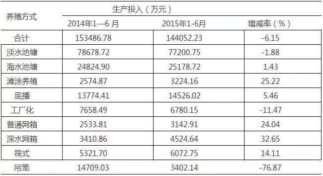 1-6月,采集点生产总投入14.41亿元,同比减少6.15%。饲料费、水电燃料投入同比增加,苗种费、人员工资、基础设施、鱼药及水质改良、水域租金和其他投入同比减少。其中,苗种费(占总投入29.83%)同比减少21.81%,主要是由于部分中高价位养殖品种苗种单价大幅下降导致苗种费同比显著下降;饲料费(占总投入29.16%)同比增加8.06%,呈逐年增加的趋势。分养殖方式看,深水网箱、滩涂养殖、普通网箱、筏式、底播、海水池塘生产投入增加,其中深水网箱投入增幅显著,吊笼、工厂化、淡水池塘生产投入同比减少(表3)。