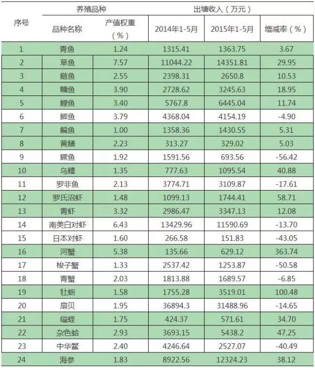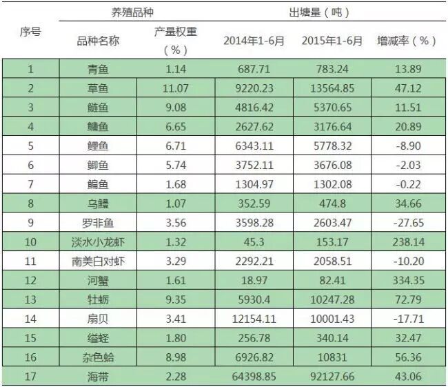 表1 产量权重超过1%的养殖品种出塘量增减情况