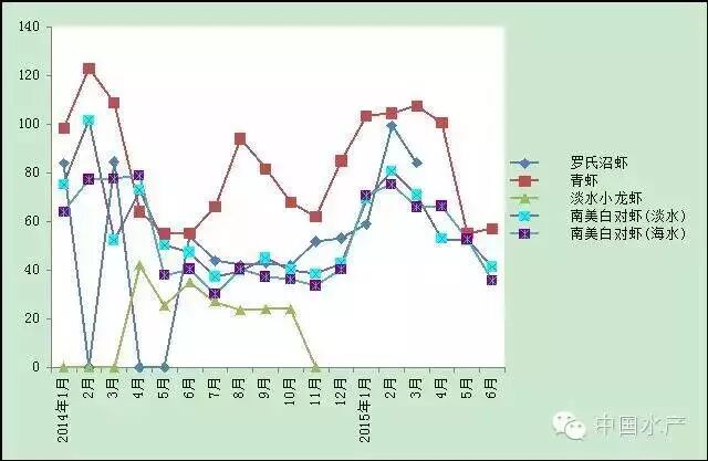 5.蟹类。河蟹、青蟹出塘价格上涨,梭子蟹出塘价格下跌。从价格走势看,青蟹和梭子蟹出塘价格在春节假期间达到高位后出现明显回落,河蟹上半年出塘价格呈稳步上升趋势(图5)。