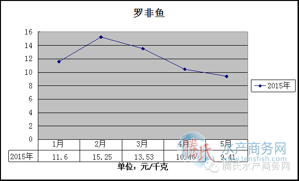 该数据说明,由于去年存塘量少,因而上半年出塘量同比下降,造成罗非鱼市场价格表现为稳中有涨(图4),1-3月份综合出塘价格13.64元/千克,4-5月价格就开始下降。这是因为每年这该时间段该鱼存塘量增多,而该鱼主要用于加工出口,而此时正是国际市场需求淡季,加工厂出口订单少,需求不足,因而造成市场价格行情走低。