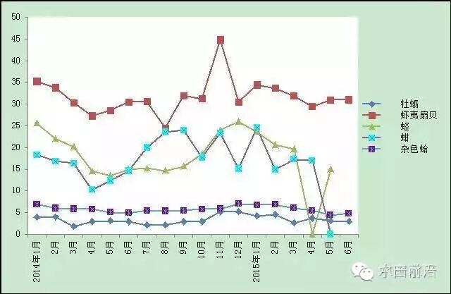 6.贝类。杂色蛤、海湾扇贝出塘价格同比小幅下跌,其余主养贝类综合出塘价格同比上涨。(图6)。