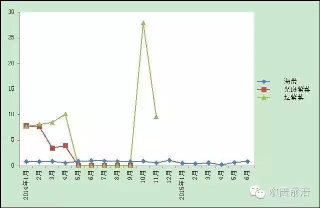 7.藻类。2014年海带、坛紫菜库存压力较大,上半年集中出售后市场饱和,出塘价格同比显著下跌;条斑紫菜出塘价格同比显著上涨(图7)。