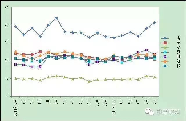 1.大宗淡水鱼类。鲤鱼今年上半年出塘价格同比上涨24.51%,达到了近年高位;鲫鱼、鳙鱼、鲢鱼出塘价格基本保持稳定;青鱼、草鱼跌幅超过10%。从价格走势看,多数大宗淡水鱼类出塘价格自去年10月起呈缓慢上升趋势(图1)。