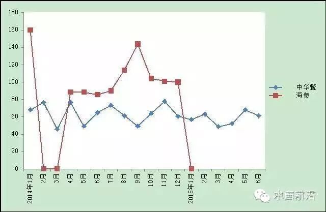图8中华鳖和海参出塘价格走势图(单位:元/千克)