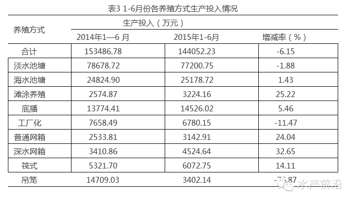 1-6月,采集点生产总投入14.41亿元,同比减少6.15%。饲料费、水电燃料投入同比增加,苗种费、人员工资、基础设施、鱼药及水质改良、水域租金和其他投入同比减少。其中,苗种费(占总投入29.83%)同比减少21.81%,主要是由于部分中高价位养殖品种苗种单价大幅下降导致苗种费同比显著下降;饲料费(占总投入29.16%)同比增加8.06%,呈逐年增加的趋势。分养殖方式看,深水网箱、滩涂养殖、普通网箱、筏式、底播、海水池塘生产投入增加,其中深水网箱投入增幅显著,吊笼、工厂化、淡水池塘生产投入同比减少(表3)。