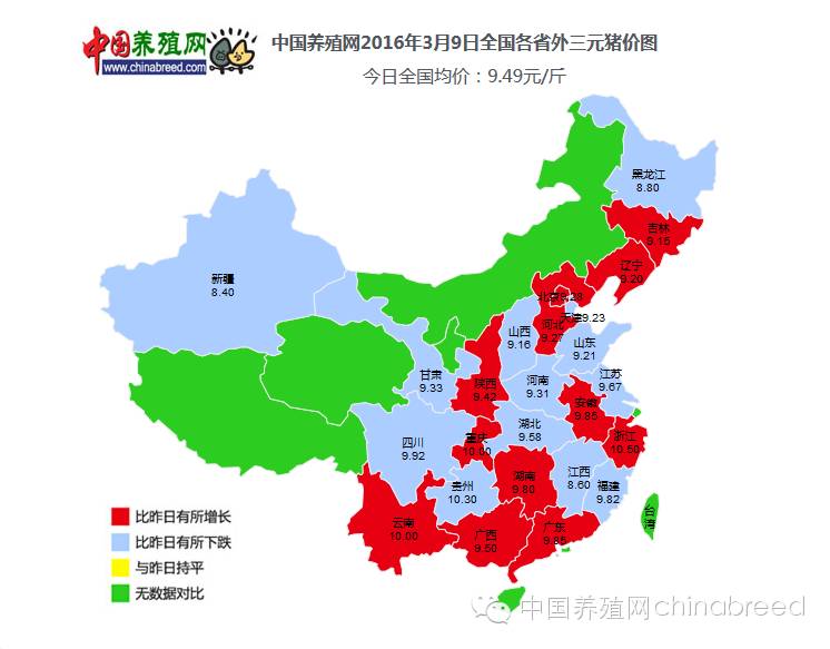 2016年3月9日全国生猪均价18.11元/公斤,价格较昨日上涨0.17元/公斤,今日全瘦肉型生猪均价18.6元/公斤,价格较昨日上涨0.24元/公斤。今日全国27省、直辖市范围内,共计24省份猪价上涨,3省份猪价下跌。全国最高价为贵州,较昨日上涨0.02元/千克于20.64元/千克;全国最低价为新疆,较昨日上涨0.00元/千克于17.58元/千克。甘肃上涨0.22元/千克,云南上涨0.20元/千克,安徽上涨0.14元/千克,福建上涨0.14元/千克,广东上涨0.14元/千克,陕西上涨0.14元/千克,山西上涨0.13元/千克,河北上涨0.12元/千克,大幅上涨。北京下跌0.04元/千克,四川下跌0.02元/千克,小幅下跌。新疆于昨日持平。