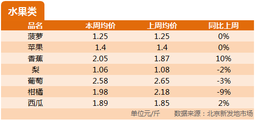 据监测显示,本周(2017年11月13日—11月19日),重点监测的7种水果均价为1.74元/斤;上周均价为1.85元/斤,与上周相比基本持平。
