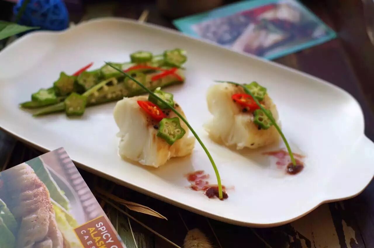 5. 从锅中取出点缀上秋葵、红椒和小葱,趁热食用鱼肉鲜美多汁,入口即化。
