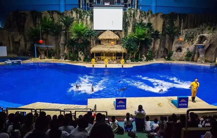 圣亚海洋世界以丰富多彩、独具特色的海洋动物表演见长,其中“三大表演、两大王牌、一大天幕”是最具特色的项目。海洋馆里面有亚洲最长的海底隧道,其中的梦幻海豚湾表演场灯光效果非常绚丽,人鱼表演也十分出彩。