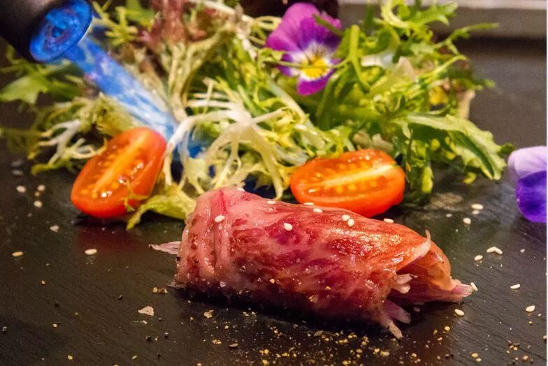 采用日式烹饪手法,将雪花牛肉切成薄片