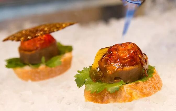 经过低温蒸煮过后再将其冷却制成鹅肝蜜冻
