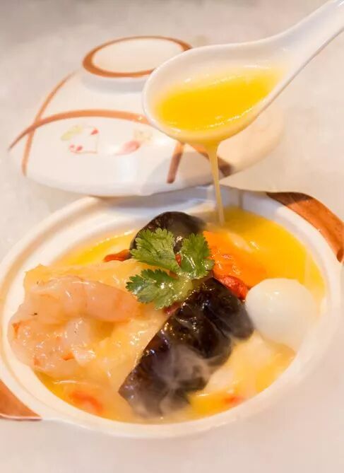 再加入海参、鲍鱼、花菇、蹄筋、鱼肚、鹌鹑蛋等
