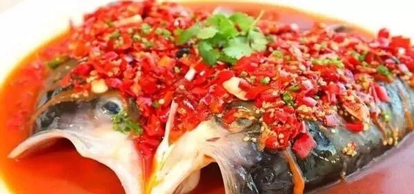 6、从锅中取出碗后,再将炒锅置火上放油烧至十成热,铲起淋在鱼头上即成。