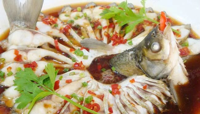 5、将蒸好的鱼取出,倒掉蒸出来的水分,尾部装修上红椒圈,撒上葱末,最终淋上蒸鱼鼓油和麻油即可。