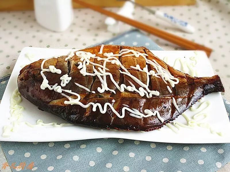 ④ 把葱段加入后腌制2小时,之后放入烤盘,把酱料再均匀的抹在鱼身上后把葱段和姜片全部塞进鱼肚里。