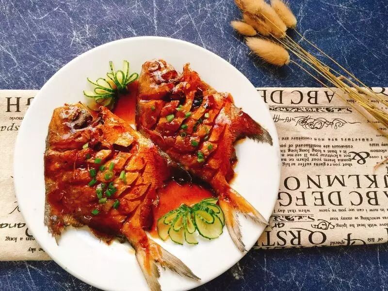 ⑥ 炸好的鱼摆上盘子,浇上汁液,撒上葱花即可食用。
