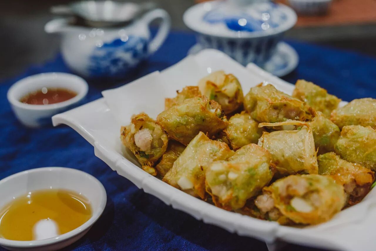 炸至金黄香脆的腐皮下是混有马蹄的猪肉馅,蘸点同吃,十分的香口有风味~
