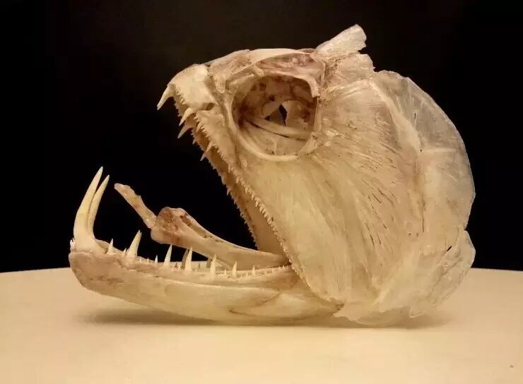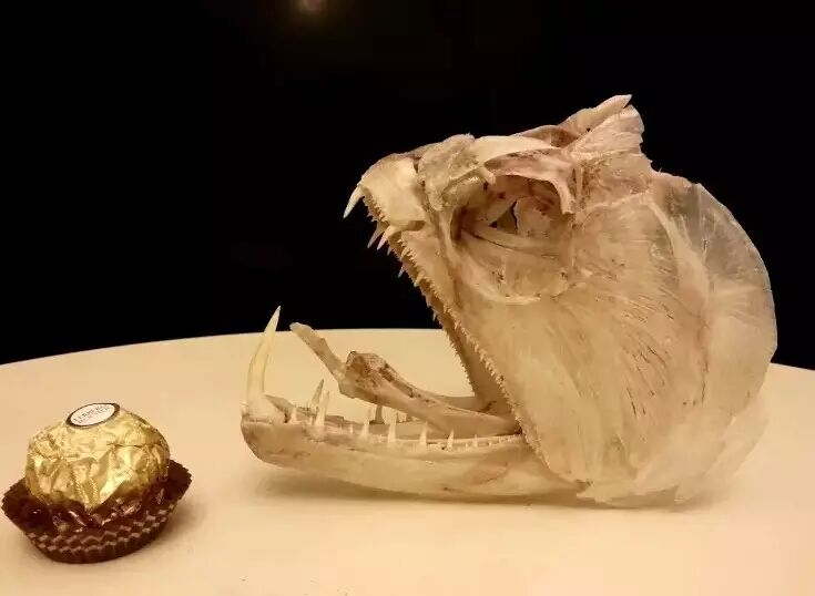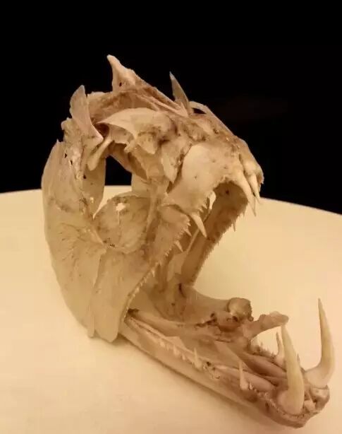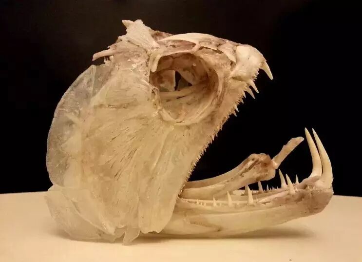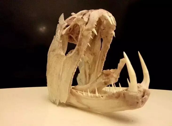 鱼头在开水中焯过1-2分钟,用镊子取出大块肌肉,然后沥干水分放到1KG左右面包虫中,面包虫会钻入各处缝隙将皮肉全部啃食干净。大约3~5天之后留下一副完整而干净的骨架。啃食的不同阶段可拍照记录,主要是记下不同骨片的排列和位置关系,以便最后整理复原参照使用。整理复原使用502快干万能胶按骨架解剖结构粘接而成。