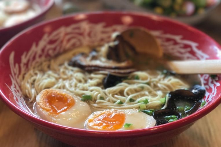 拉面的豚骨汤头特别浓郁,面条筋道,吸溜吸溜吃着贼爽,几味小菜起着很好的解腻作用,糖心蛋做得也很有水平,一碗拉面下肚十分满足。
