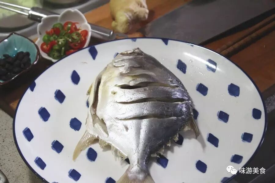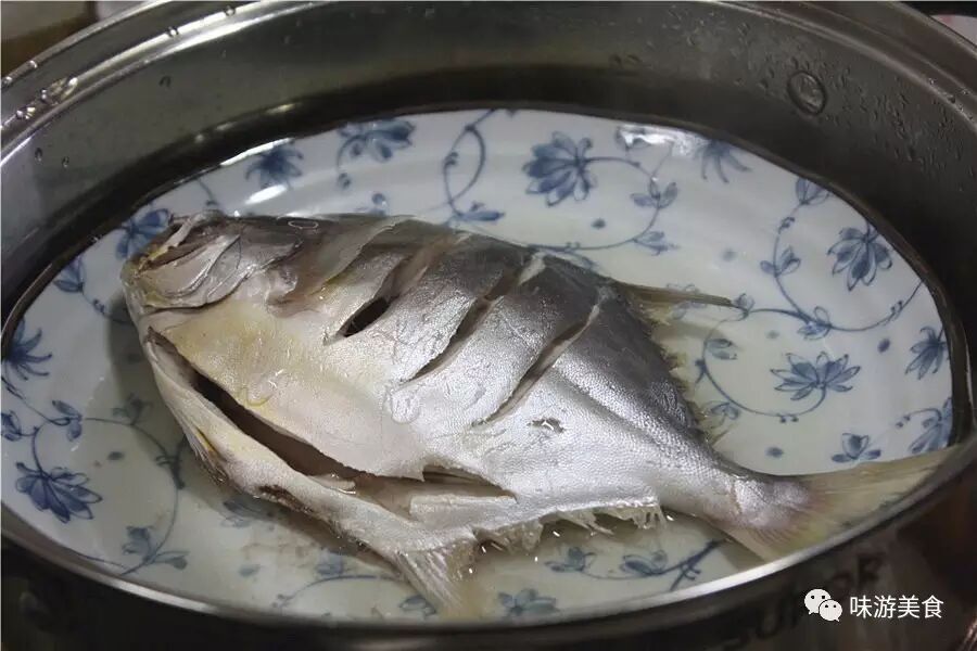 将黄鲳侧面用刀斜切两刀,姜葱水腌制大约5分钟