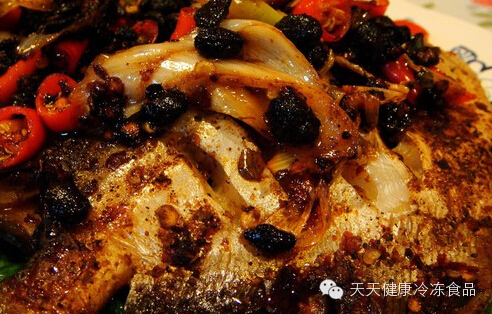鱼身擦干,刷上橄榄油,撒上粉料,抹匀。京葱斜刀切片,锡纸将葱垫在底上,放上鱼,将炒好的豆豉料淋上,将锡纸裹紧。