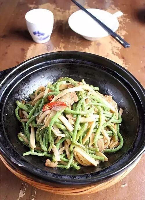 1、把豇豆切成长段,杏鲍菇切成粗丝,然后一起下入五成热的油锅里炸熟,捞出来沥油待用。