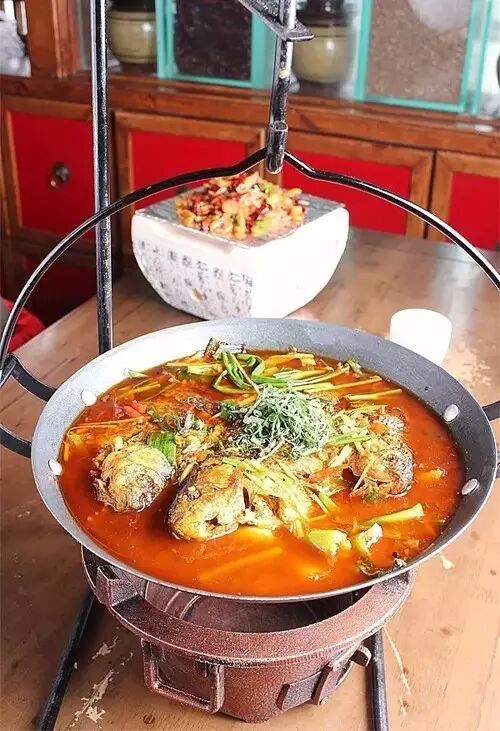 2、锅留底油,下入泡酸菜片、泡子姜片、子姜丝和豆瓣炒香出色,掺入清水烧沸后,放入炸过的鲫鱼,再加入盐、料酒、白糖、鸡精、味精、一半的藿香末和小米椒节,并用小火烧透入味,然后出锅装入垫有小葱段的吊锅内,撒入剩余的藿香末,即成。
