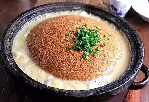 3、另锅放色拉油烧至六成热,下入自制锅巴,待炸至色金黄且酥脆时,捞出来反扣于石锅内,撒上小葱段,即成。