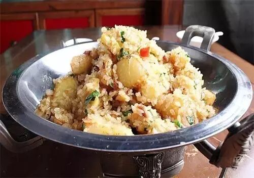 糯米200克,笔山小土豆500克,蒜苗花10克,熟腊肉粒50克。