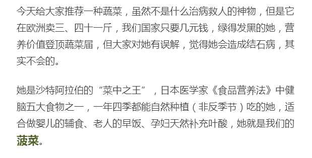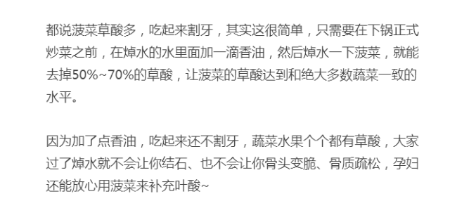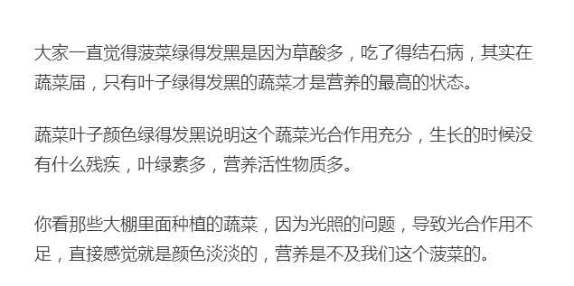 喜欢吃菠菜的人可以放心大胆吃了,不必为了这点点草酸而恐慌,欧洲人把这蔬菜都卖出了肉价,我们也赶紧吃吃吧