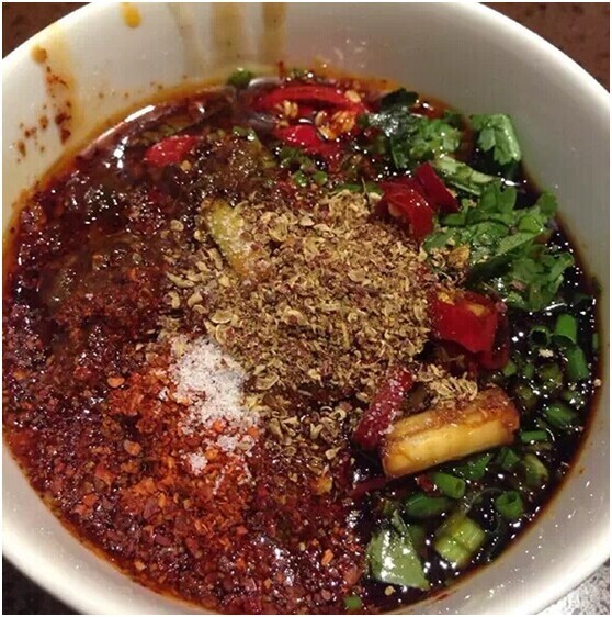 辣油打底配辣椒粉、麻椒粉、小米椒加香菜葱花![]()