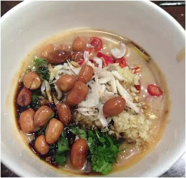 花生酱打底配海鲜酱油蒜泥海米香菜炸花生