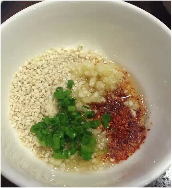 香油打底配芝麻,花生碎,蒜泥辣椒面葱花