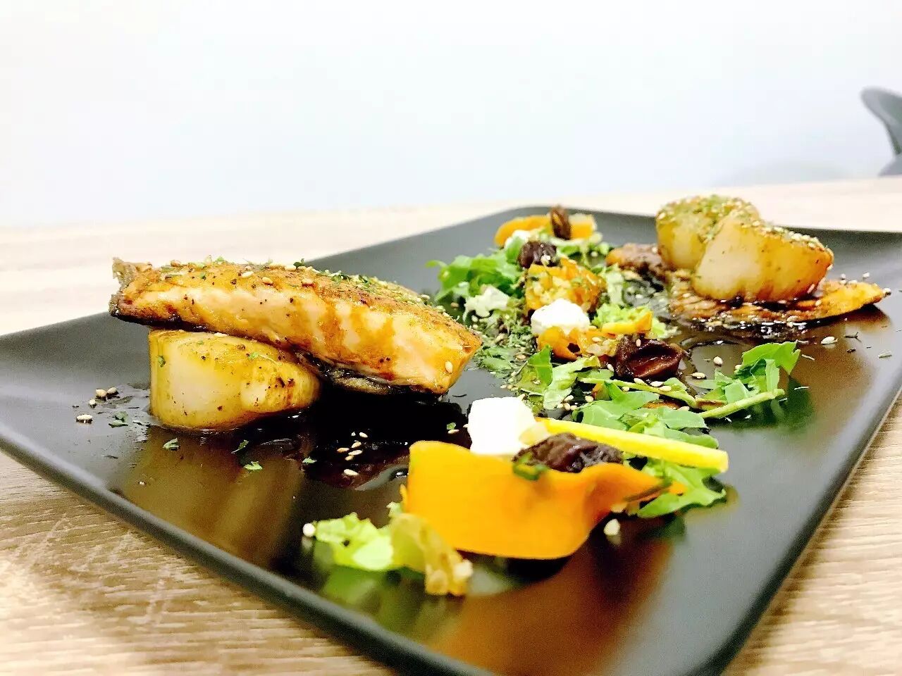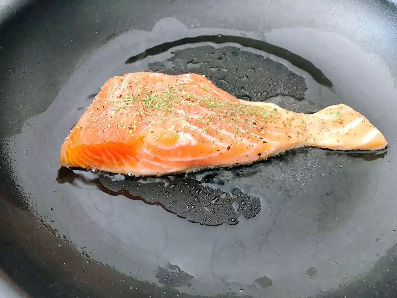 除了生吃,煎是三文鱼最快的做法了。因为本身新鲜的三文鱼就可以生吃,三文鱼不用煎很久,控制火温让鱼肉表面干酥,内部微粉,口感层次丰富。