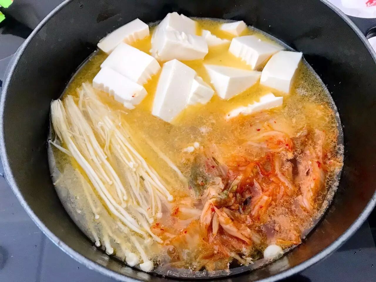 3. 等到油被慢慢炼出来,放入豆腐,金针菇,辣白菜,加水没过食材,放入半勺辣酱,半勺大酱。大火烧开,转小火盖盖儿焖约10分钟,尝一口汤,如果咸度不够,再加一点盐巴。