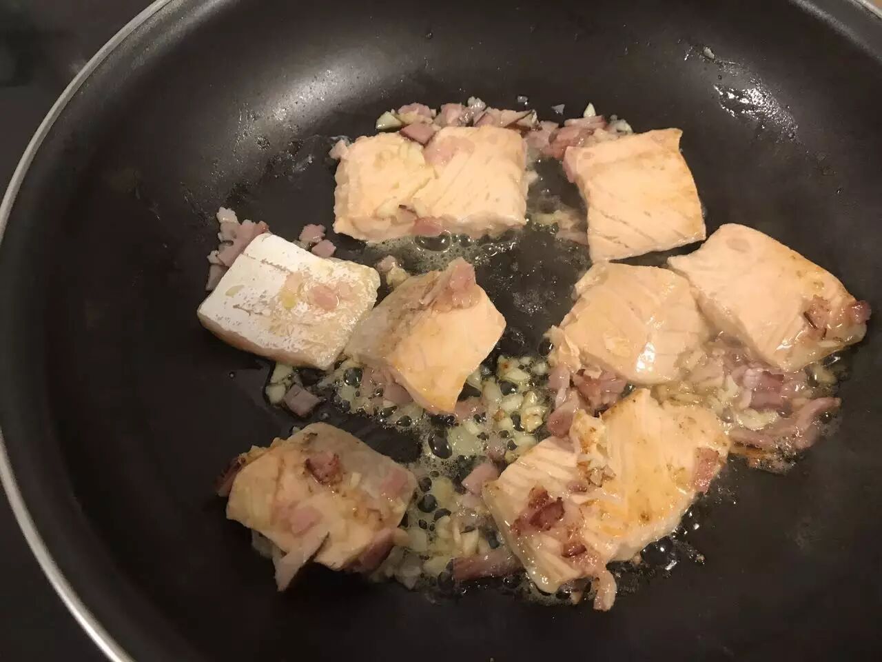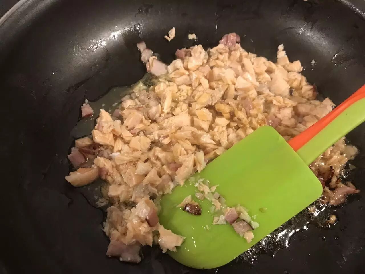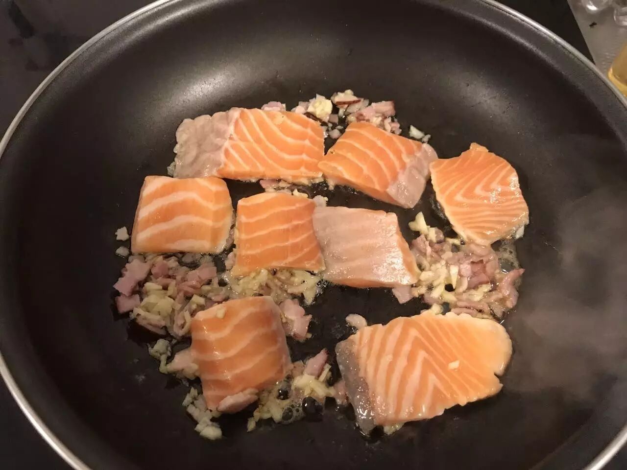 2. 将黄油放入锅中,小火融化,等全部化完,下培根末和蒜末,大火爆香。铺入三文鱼块,淋上味淋(可选),两面煎干,用锅铲轻轻捣碎,至全干。加一点酱油,加糖,挤柠檬汁避免油腻。