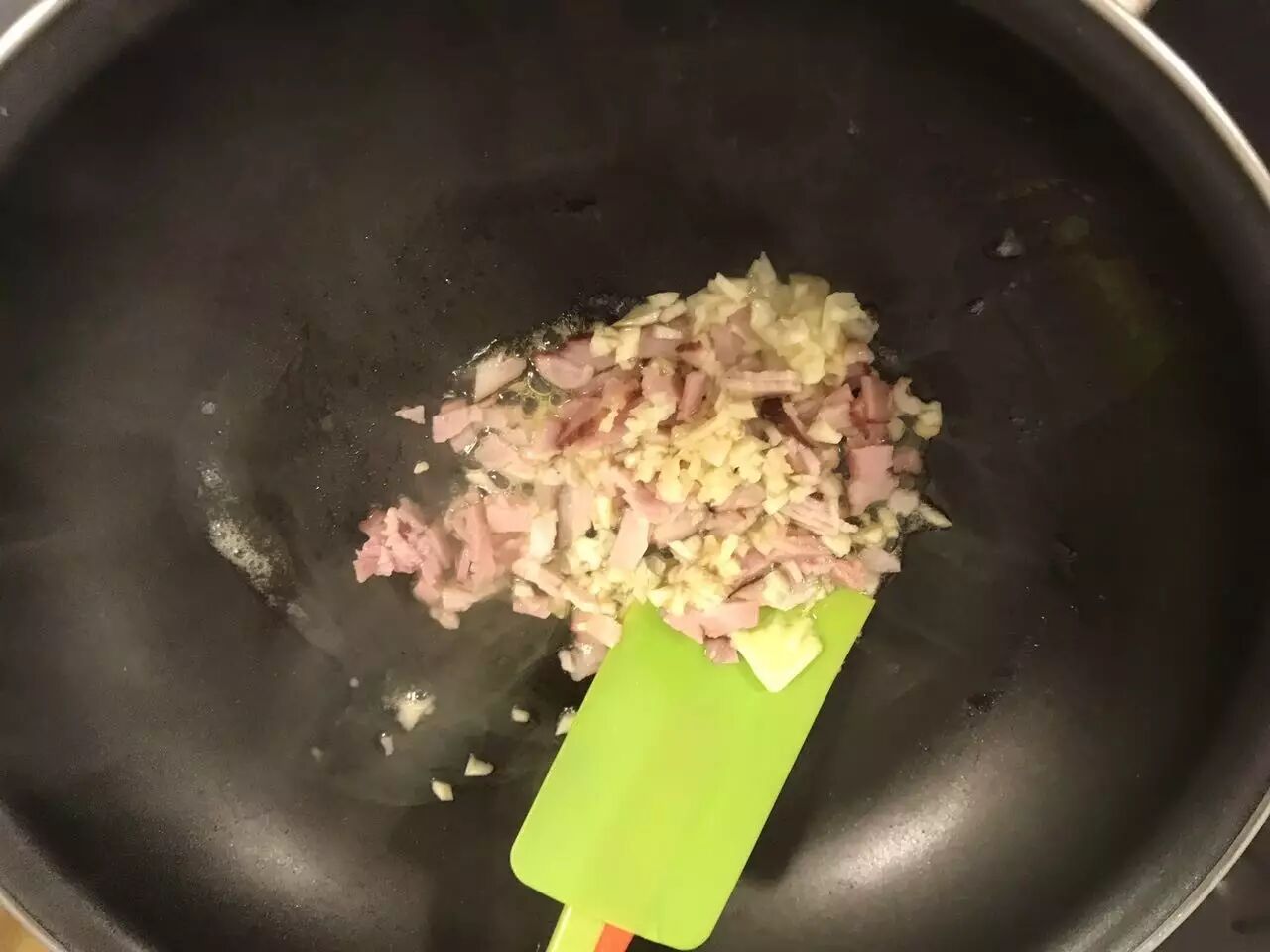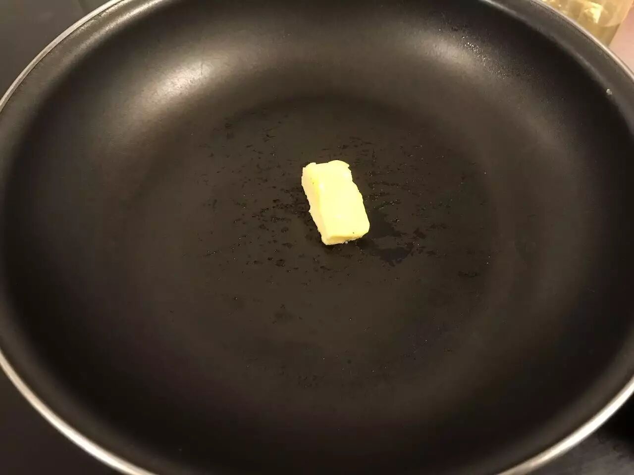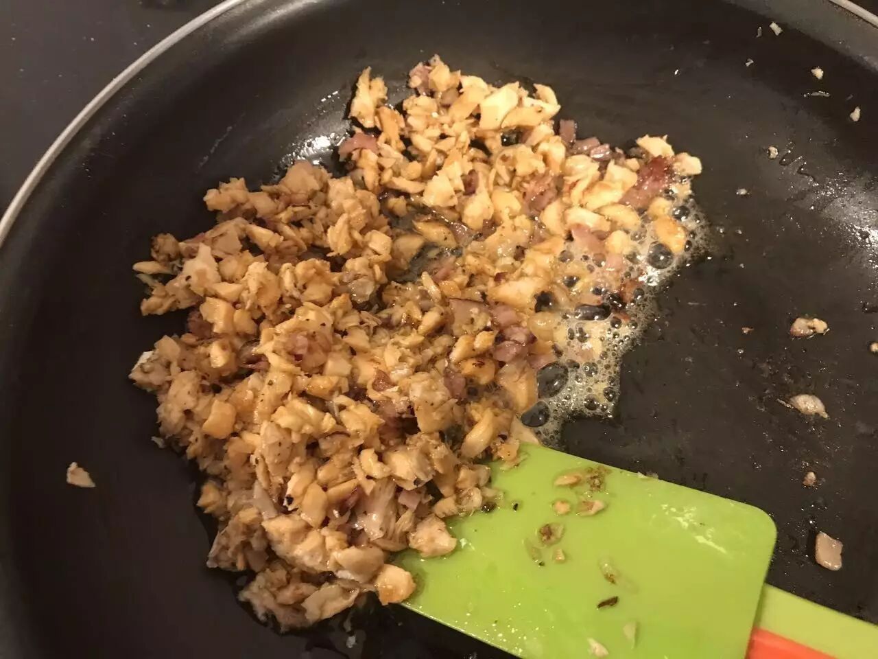 2. 将黄油放入锅中,小火融化,等全部化完,下培根末和蒜末,大火爆香。铺入三文鱼块,淋上味淋(可选),两面煎干,用锅铲轻轻捣碎,至全干。加一点酱油,加糖,挤柠檬汁避免油腻。