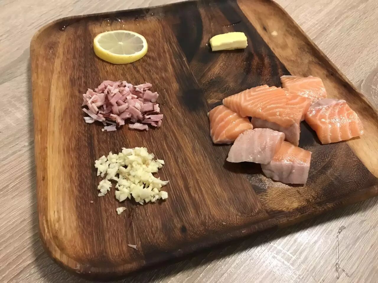 1. 片去皮三文鱼,培根切末,蒜切末,切一片柠檬,一小块黄油。