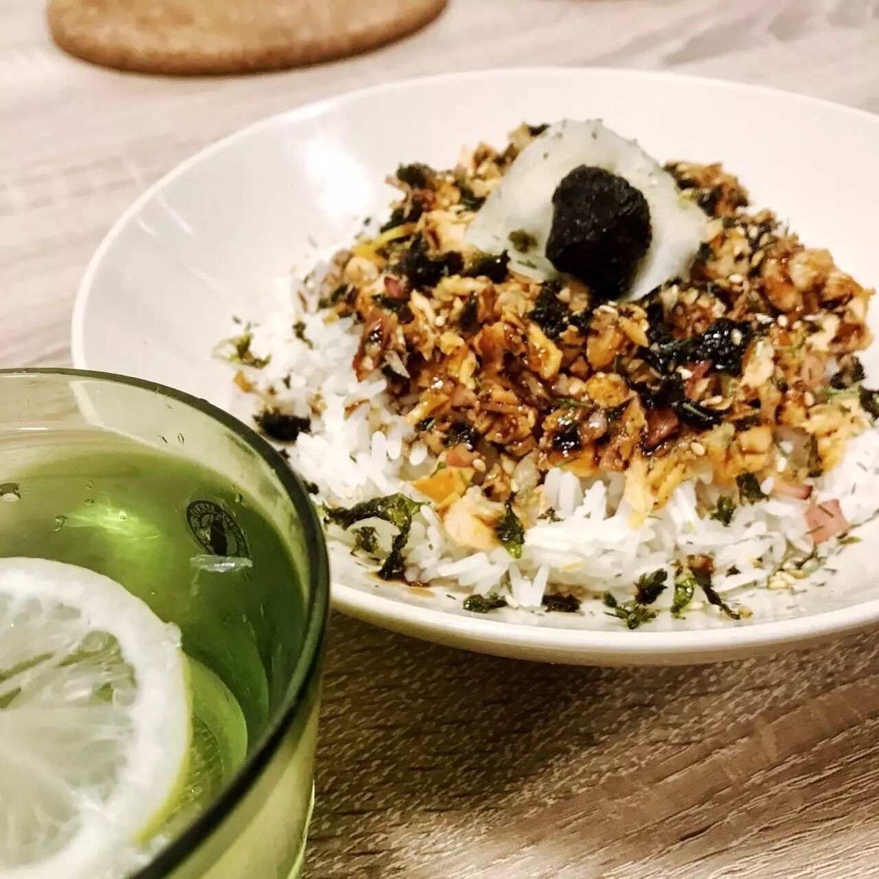 然后就上桌啦,可以淋一点调味日本酱油(可选)。深夜的幸福来自一碗香喷喷的鱼松饭!