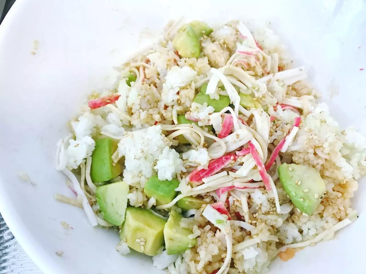 3. 首先找一个大大的碗,将牛油果淋一两滴橄榄油,撒上一点盐和黑胡椒,拌匀。加入寿司饭,蟹棒丝,黑鱼子一小勺,淋上一点拌好芥末的酱油,搅拌均匀。
