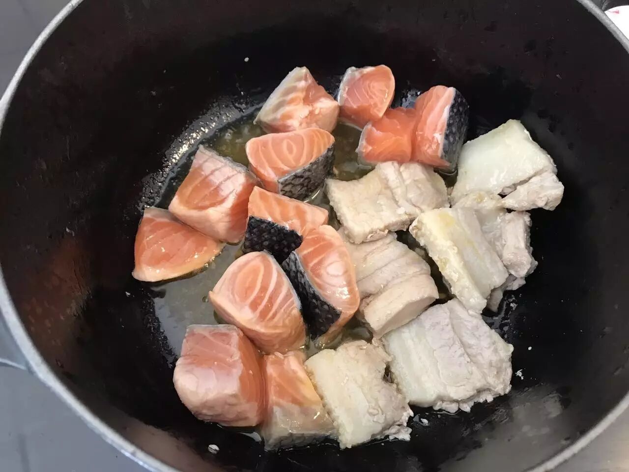 2. 选用汤锅,控制锅的热度保持较低,下一点点油保持锅底反光就好。放入三文鱼和五花肉,慢慢把油炼出来。三文鱼的油甜又香,入汤味道极好。