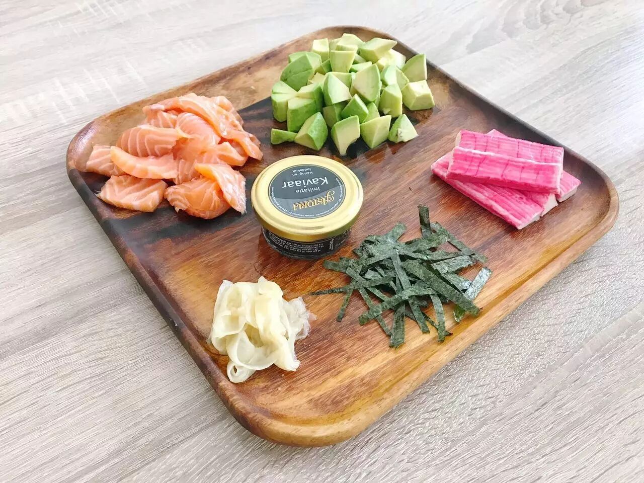 2. 三文鱼切片,这里不留鱼皮,下刀到鱼皮然后侧向一刮就可以片出无皮的生鱼片啦。配菜选择黑鱼子和蟹棒,搭配牛油果,分别配合三文鱼的鲜,甜,肥,增加口味的层次与丰富度。牛油果整个切块,蟹棒手拆成丝,海苔切条,日式甜姜可选,会增添很多风味。