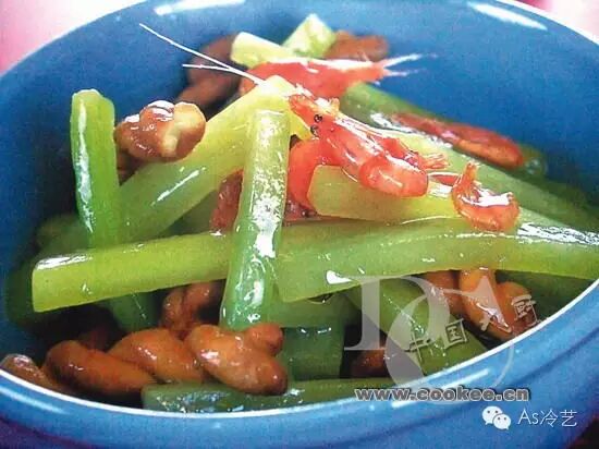 制作:青笋切手指条,和海虾一起入开水飞水1分钟。。。