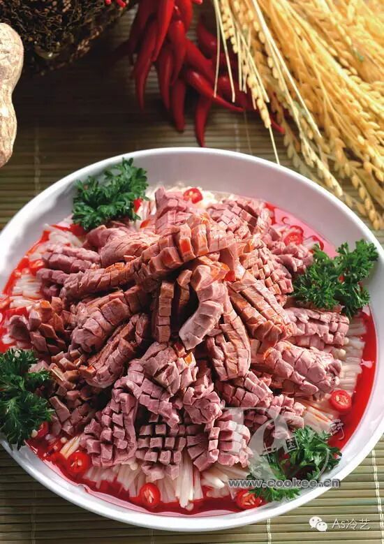孟令君试制点评:此菜很有创意,猪心的处理方法也比较到位,我严格按照味汁的比例试制了一下,猪心口感鲜嫩微带脆,口味也不错,有些类似于夫妻肺片。我感觉如果再加点蒜泥、白醋,成菜更爽口。